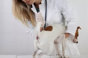Pies na stole weterynaryjnym podczas kontroli gruczołów okołoodbytowych.