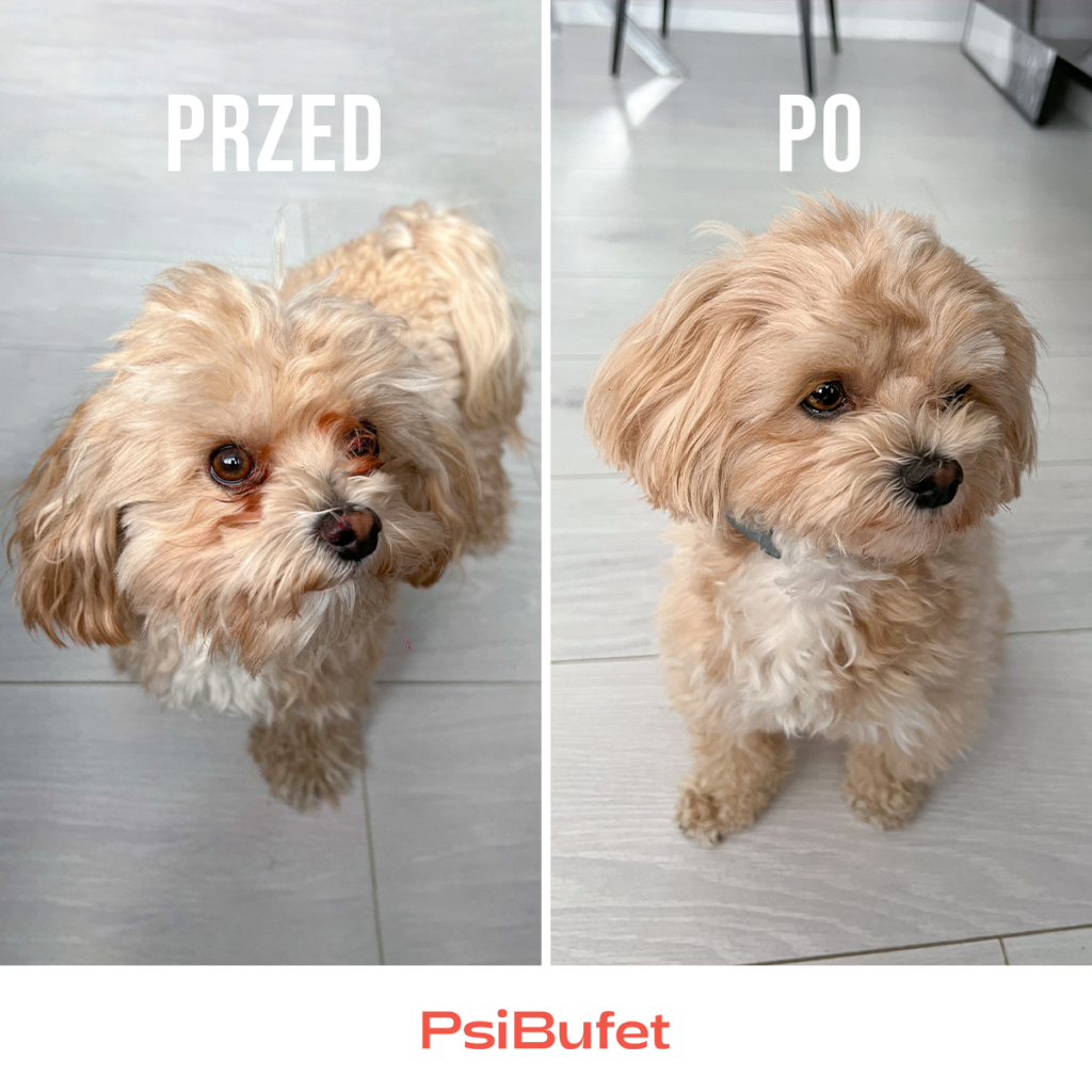 Każdy ze smaków opiera się wyłącznie na naturalnych składnikach i nie zawiera konserwantów, ani żadnych sztucznych dodatków. Mnóstwo maltańczyków, które na co dzień jedzą PsiBufet, czuje się świetnie i wygląda równie pięknie, a na ich pyszczkach nie ma śladu po brązowych zaciekach.